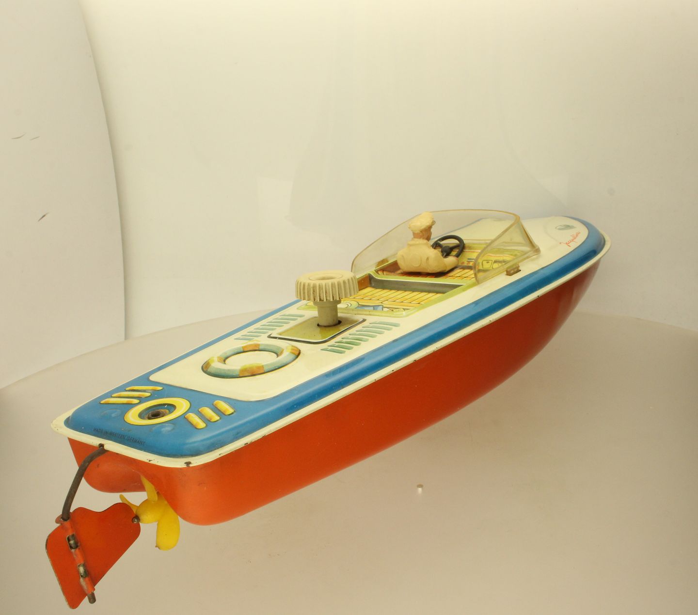 'Jacqueline' sejlbåd udført af blik. Fremstillet i Vesttyskland, 1950-60'erne. L. ca. 35 cm.