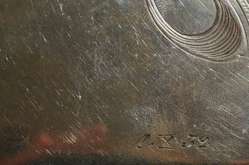 Taske af sølv, forsiden prydet med gravering i jugendstil samt datering "1. X. 32". I lukket er monteret en blå sten. Rigt stemplet. Vægt 298 gr. - 20 x 9 cm