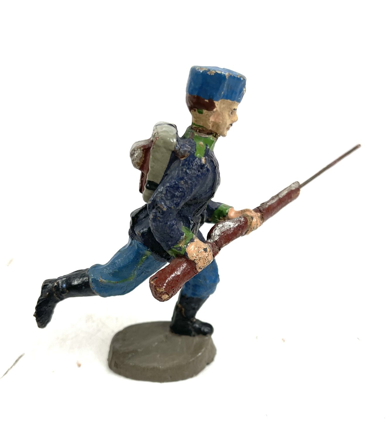 Elastolin - Fire soldater med blå uniformer, H, ca. 10 cm. Heraf liggende soldat ustemplet. L. ca. 14,5 cm.