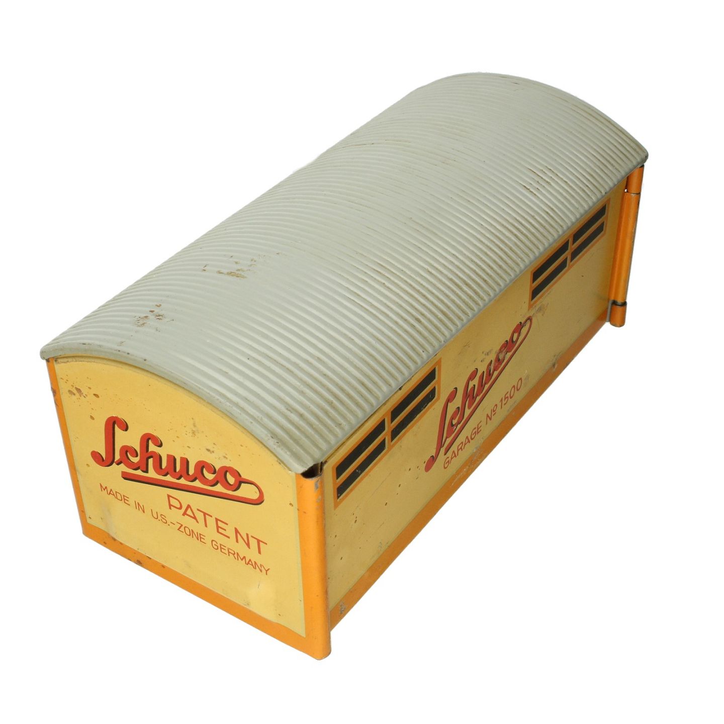 Schuco Garage nr. 1500 udført af bemalet blik. L. ca. 15,5 cm. Stemplet Patent, made in U.S.-Zone Germany.