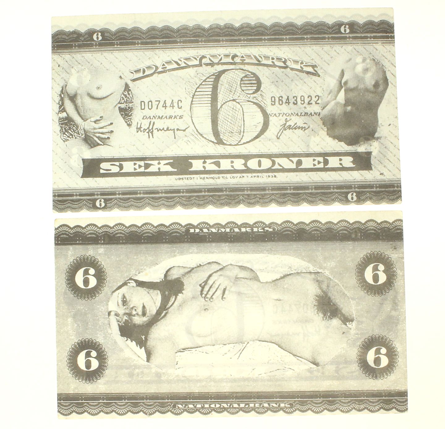 Diverse gamle rationeringsmærker samt to frivole satire sedler