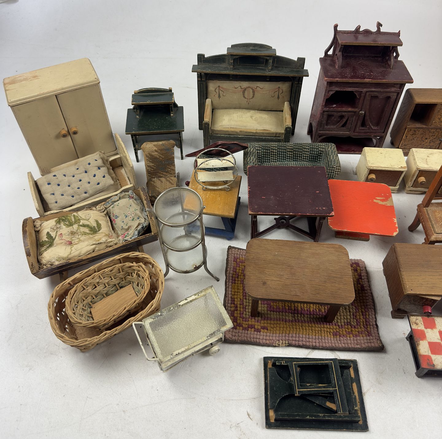 En samling diverse dukkehus møbler bl.a. bestående af: borde, skrivebord, stole, kommoder samt skabe. Varierende størrelser. Fremstår med brugsspor, flere dele med defekter / afskalninger.