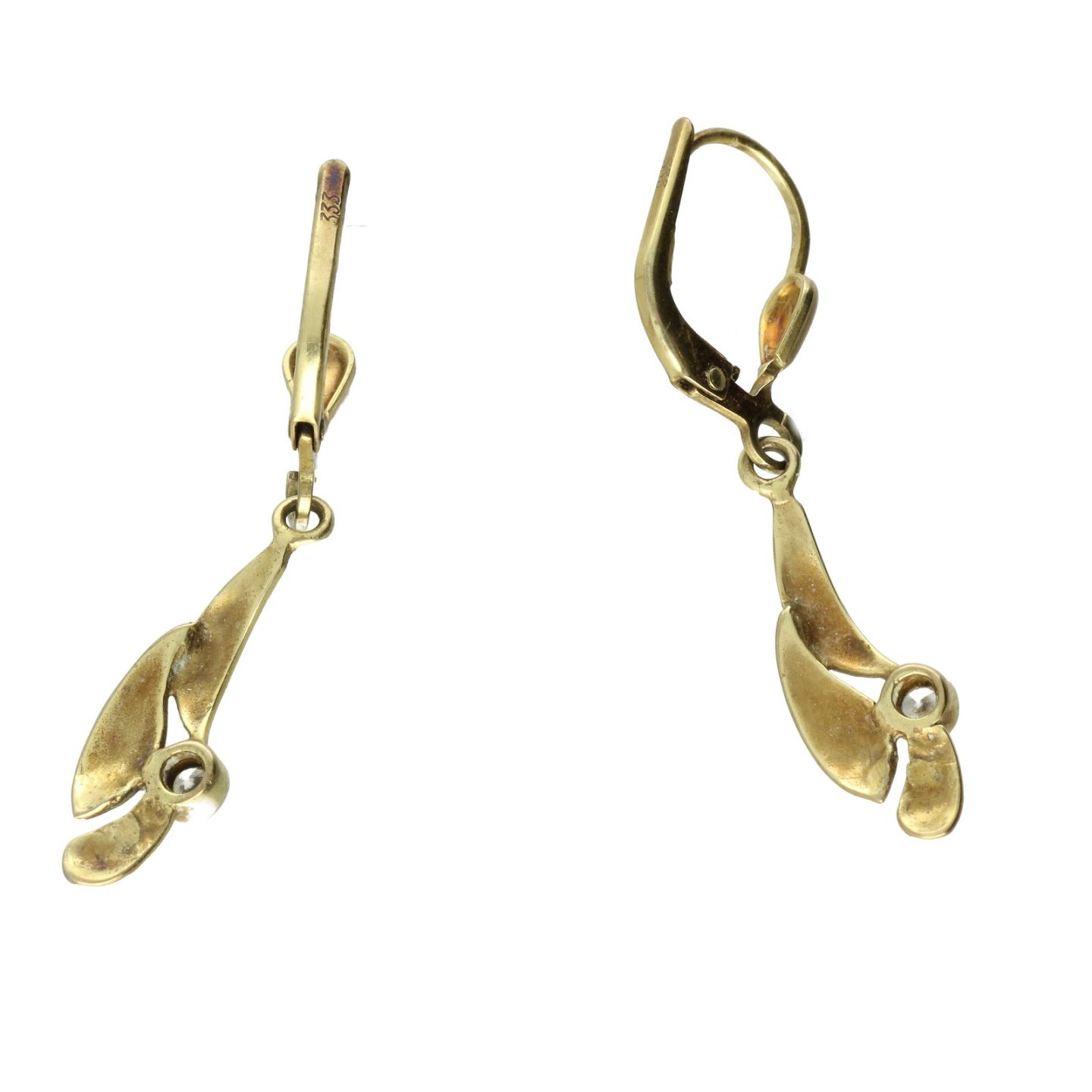 Par øreringe udført af 8 kt. guld fattet med klare sten. L. ca. 3,2 cm. Vægt: ca. 1,51 gr.