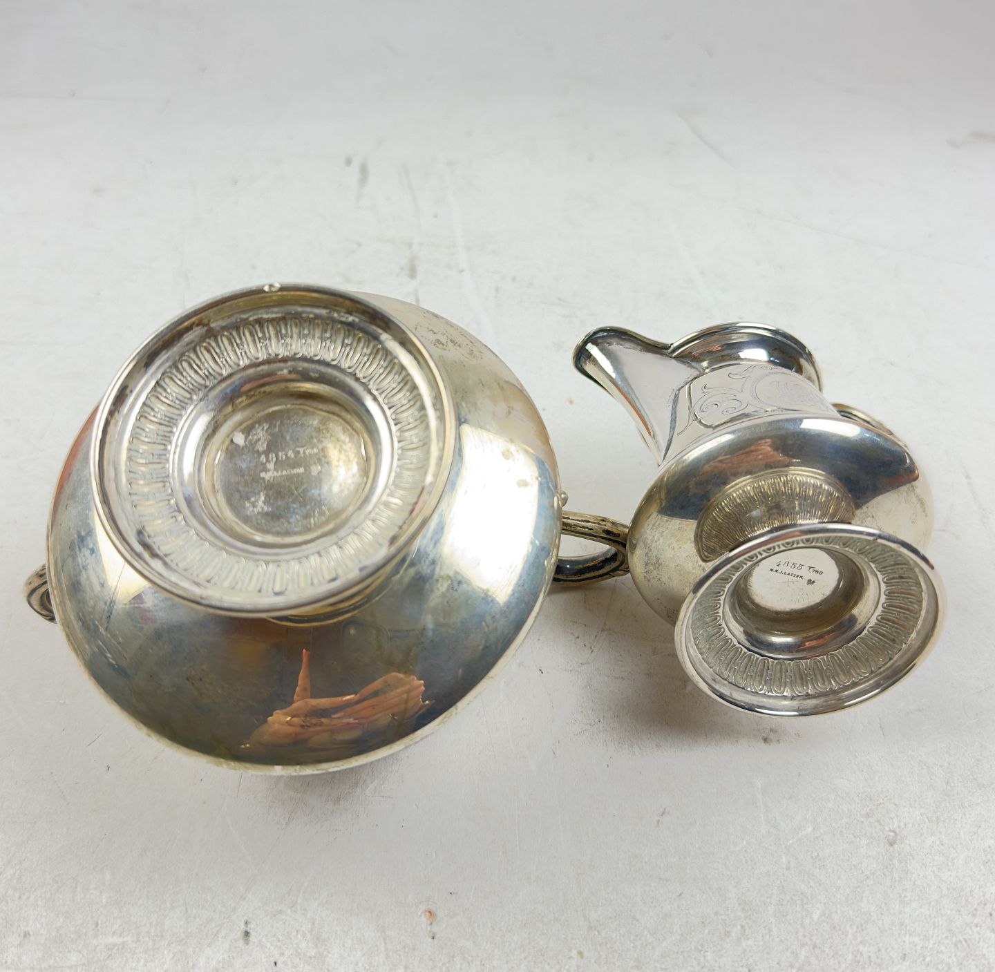 Flødekande samt sukkerskål udført af sølv. Stemplet M.N.J. Lassen nr. 4854 og 4855 samt 0.750. H. maks: 12 cm. Ø. maks inkl. hanke: 16,5 cm. Samlet vægt: ca. 251 gr.