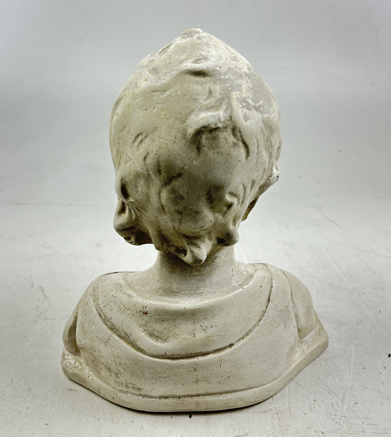 Buste udført af gasbeton. H. ca. 26 B. 21 cm. Fremstår med afslag nederst på front.