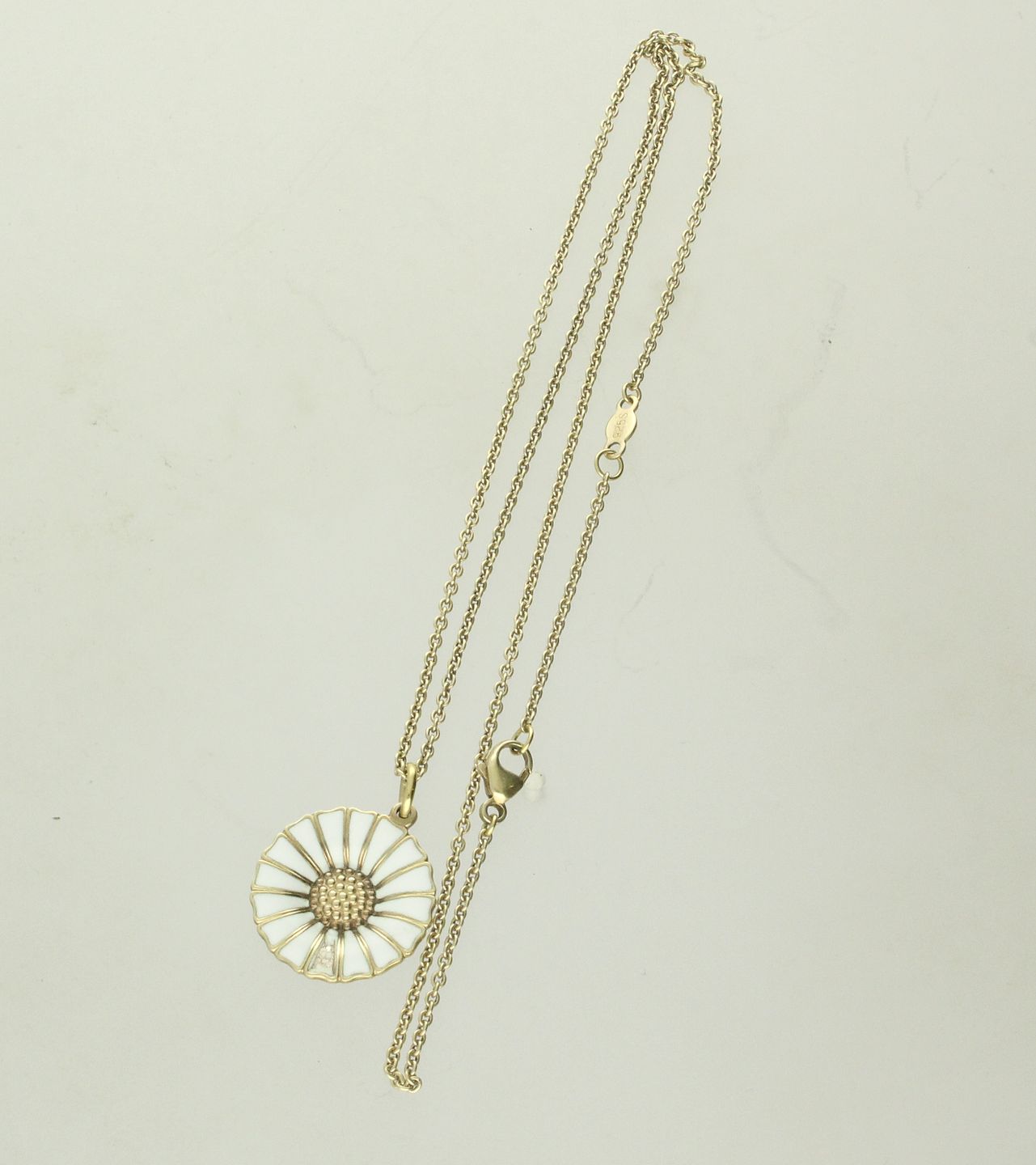 Georg Jensen - 'Marguerit' halskæde samt ring udført af forgyldt sterling sølv / hvid emalje. L. på halskæde: ca. 45 cm. Ringstr: 50. Samlet vægt: ca. 10 gr. Fremstår med skader på emalje.