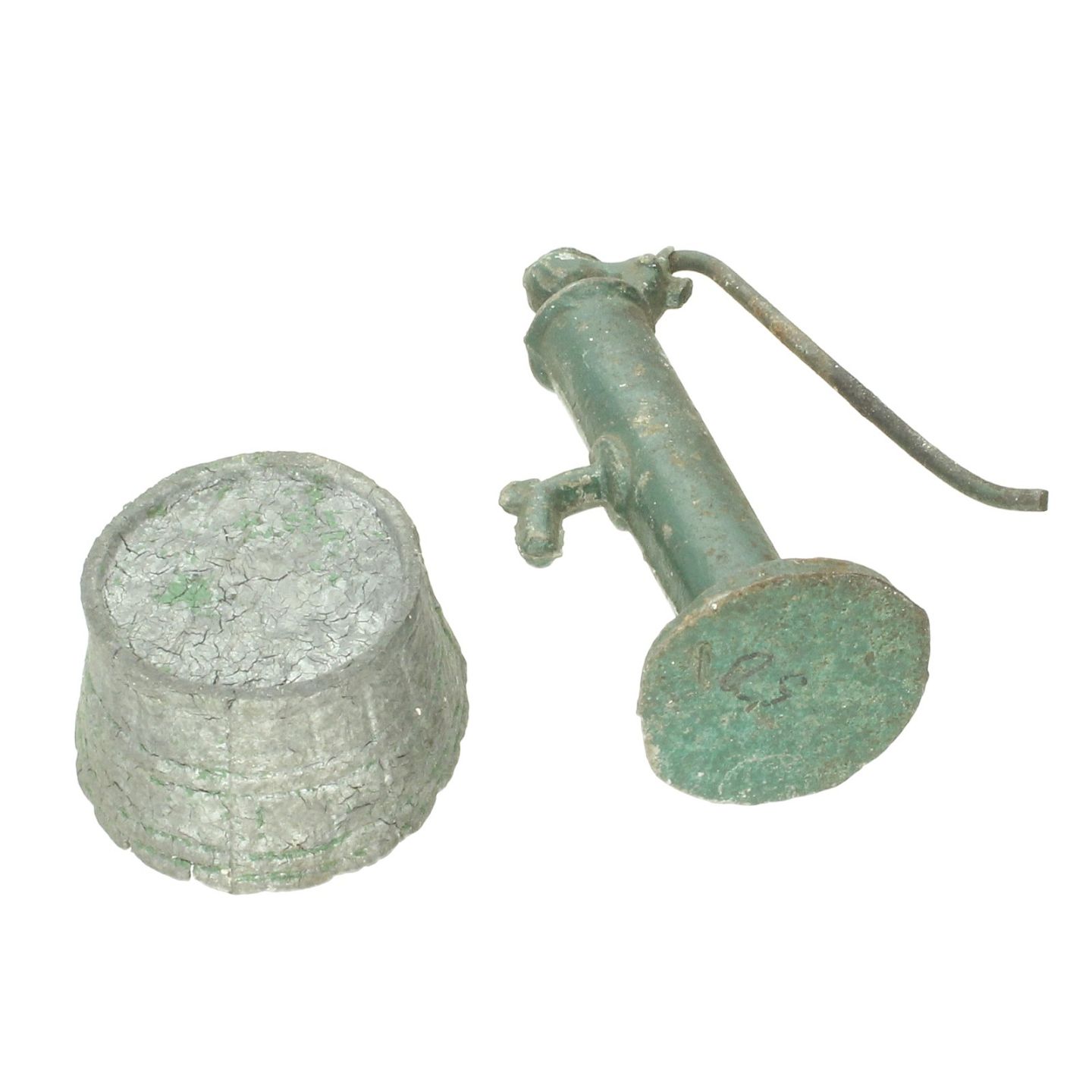 Miniature havepumpe inkl. spand af metal. H. havepumpe: 6,5 cm. Ø. spand: 3,5 cm.