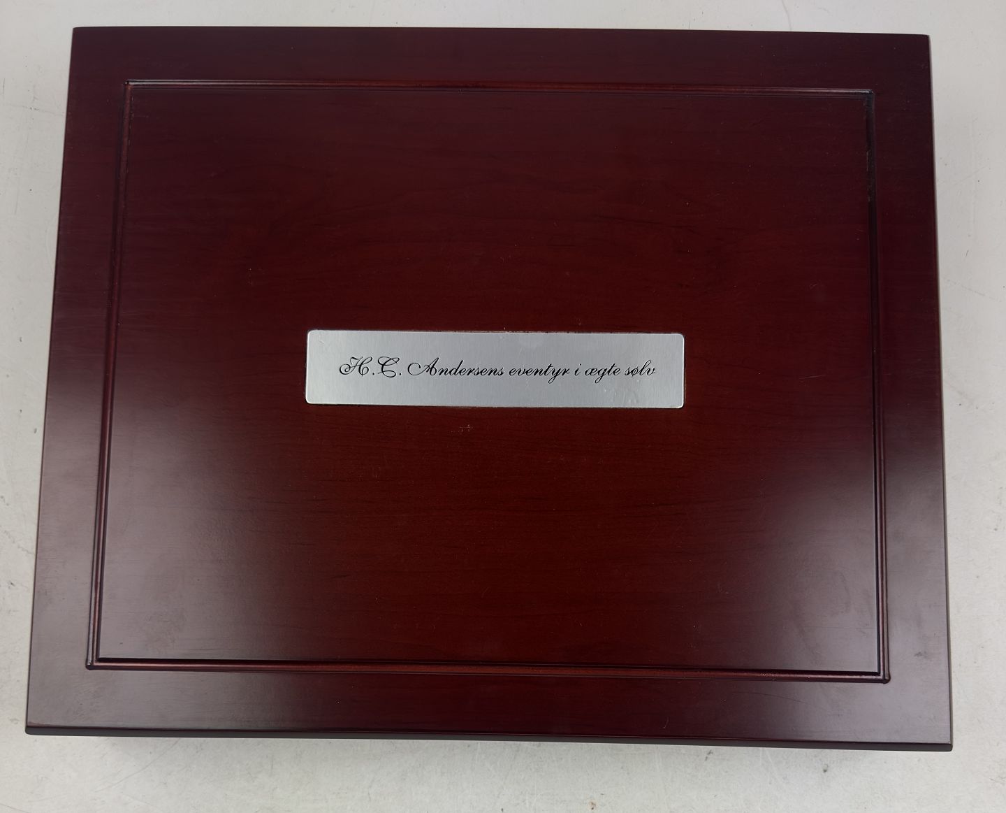 Komplet sæt H.C. Andersen medaljer af sølv på 4 bakker i præsentationsæske, præget i anledning af H. C. Andersens 200 års jubilæum 1805 - 1875 i 2005 med forskellige motiver fra H.C. Andersens eventyr. I ALT 2 KG. FINSØLV.