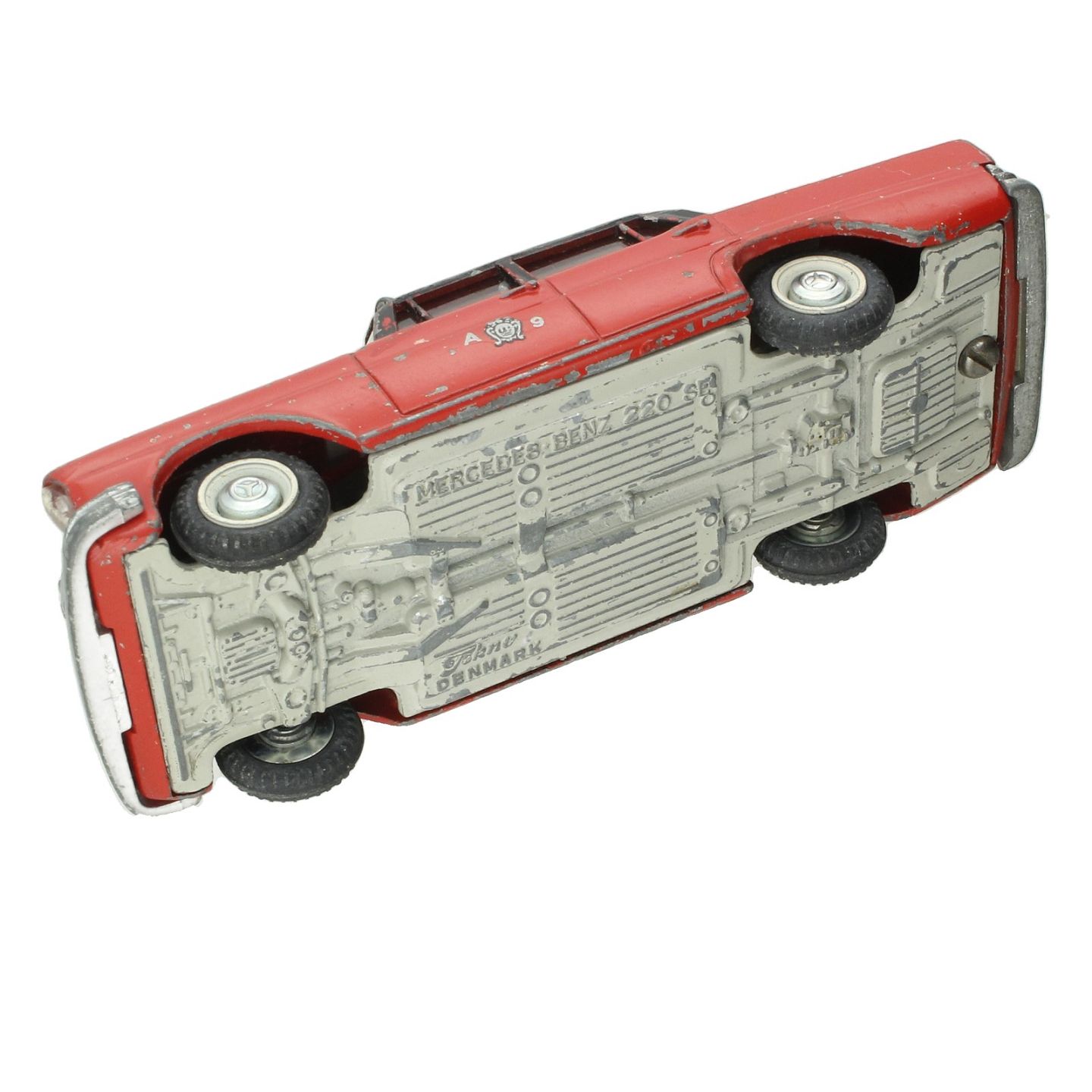Tekno Danmark - Mercedes benz 220SE udført af bemalet metal. L. 11,5 cm. Fremstår med afskalninger / rester af rødmaling på bilens tag.