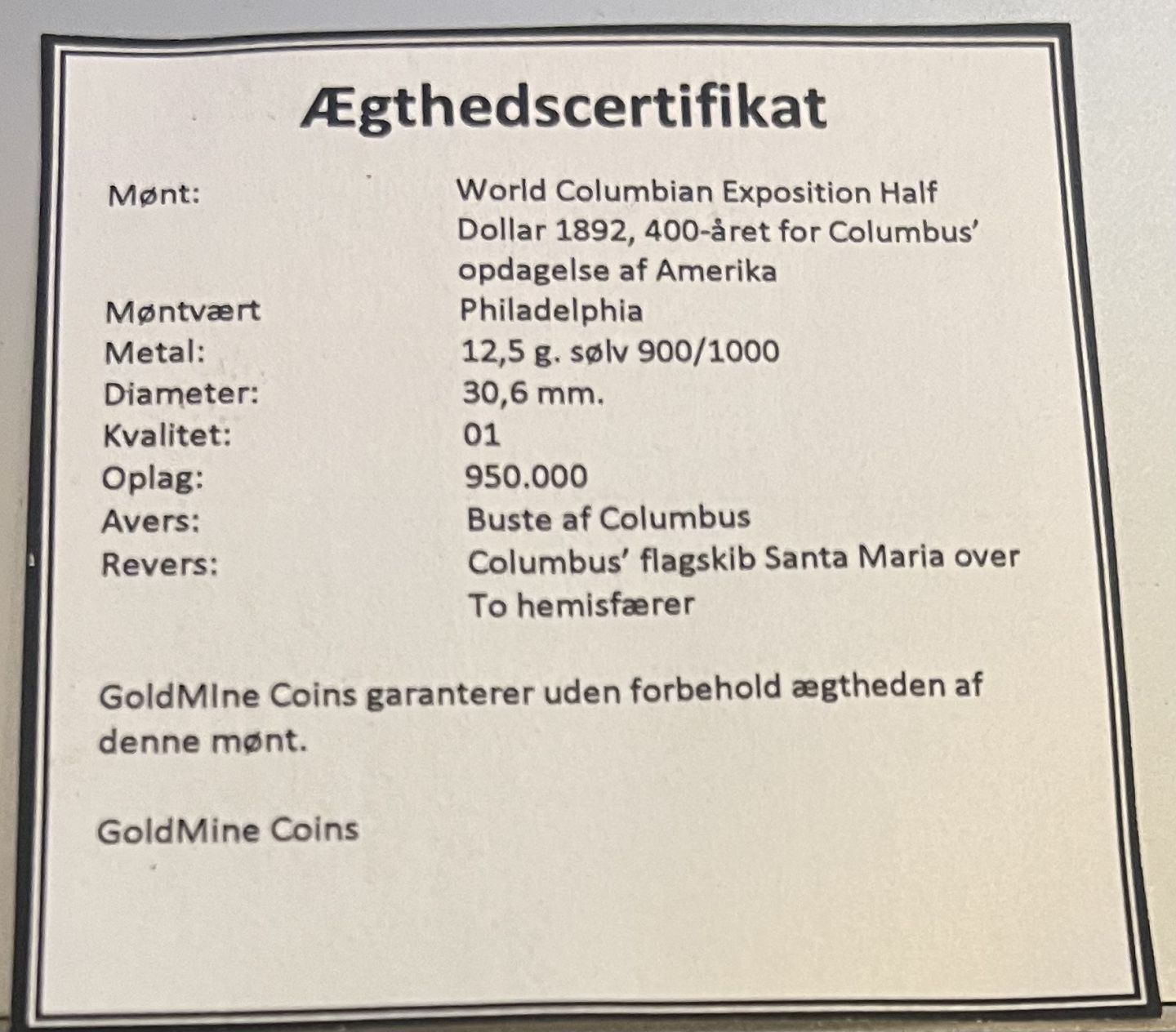 Møntæske og certifikat medfølger