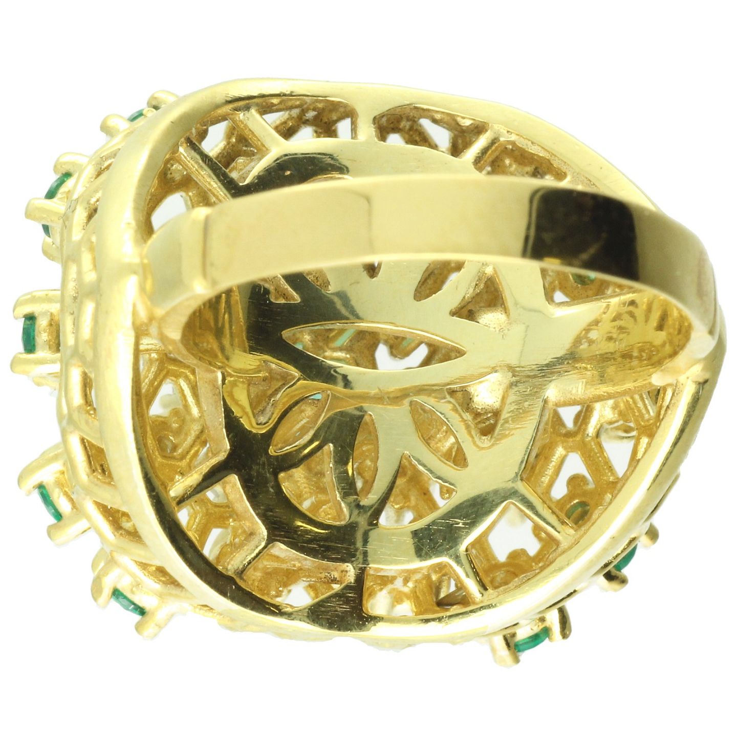 Ring udført af 9 kt. guld fattet med klare og grønne sten. Ringstr: 56,5. Vægt: ca. 13,14 gr.