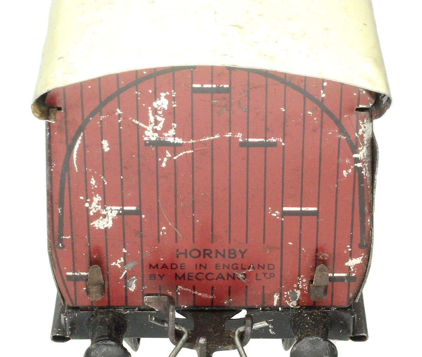 Hornby - Ældre togvogn udført af bemalet blik. Made in England by MECCANO. L. ca. 16 cm. Fremstår med ridser.