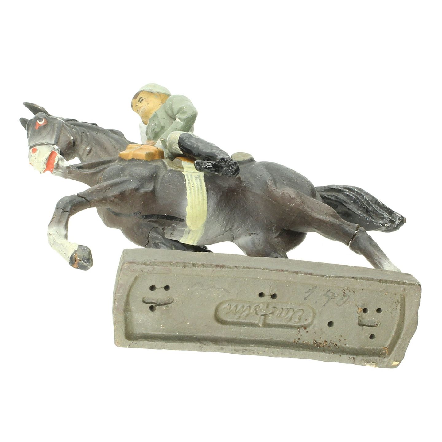 Elastolin - Tysk officer på hest, ca. 1937-1945. L. ca. 9,5 cm. Fremstår med små revner, bl.a. på hale og hestens ben.