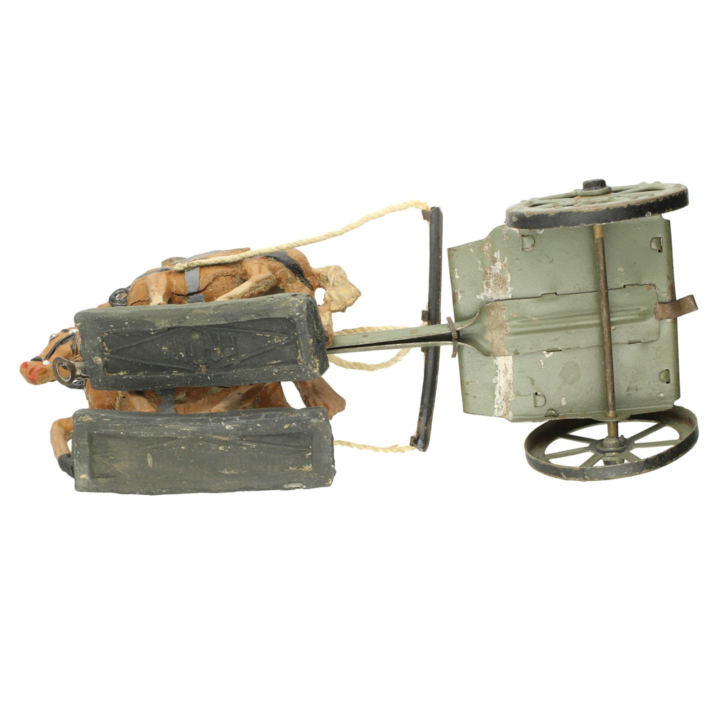 Fruha - Ældre miniature hestevogn. L. ca. 18 cm. Fremstår med afskalninger samt heste med revner.