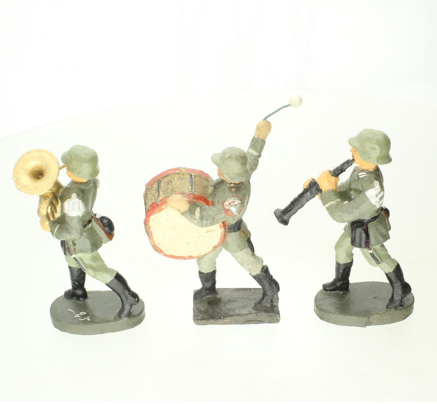 Elastolin, Schosso m.fl. En samling soldater med forskellige instrumenter, bl.a. tromme, cymbals, fløjte og trompet. H. ca. 7-8 cm.
