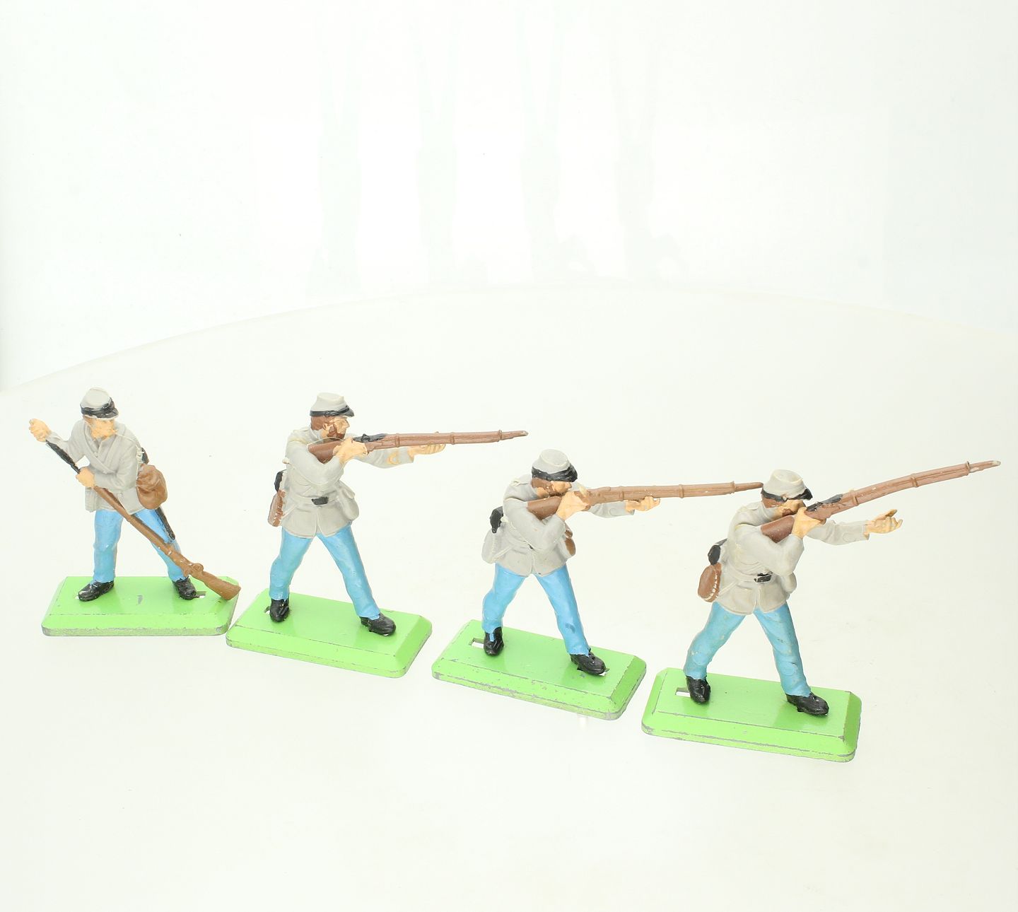 Deetail Britains LTD - En samling soldater monteret på plader af grøn og gul bemalet metal. Made in England. H. ca. 5-6 cm.