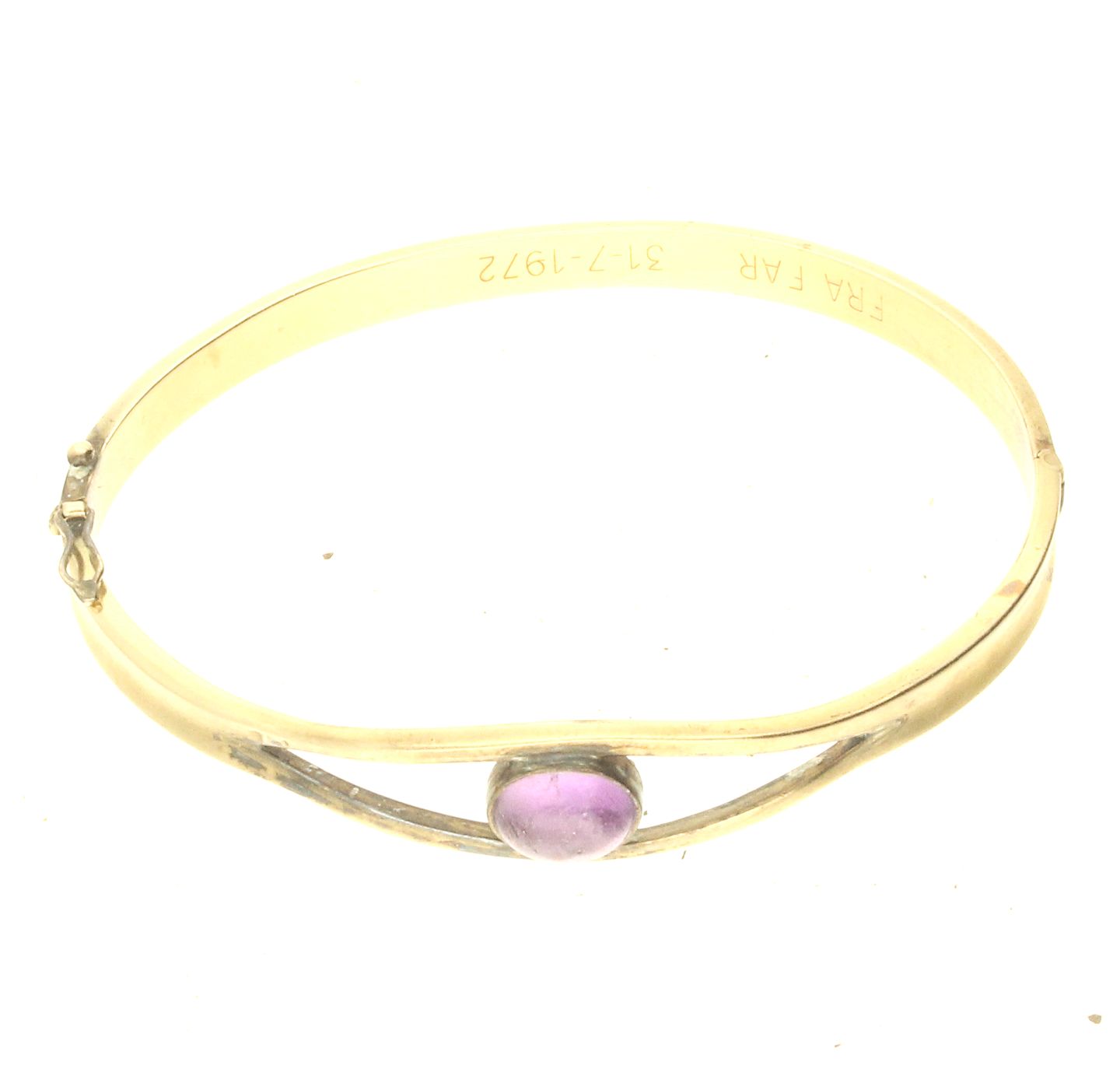 Armring udført af 8 kt. guld fattet med lilla sten. Ustemplet. Syretestet til 8 kt. guld. Mål: 6 x 5 cm. Vægt: ca. 10,04 gr.