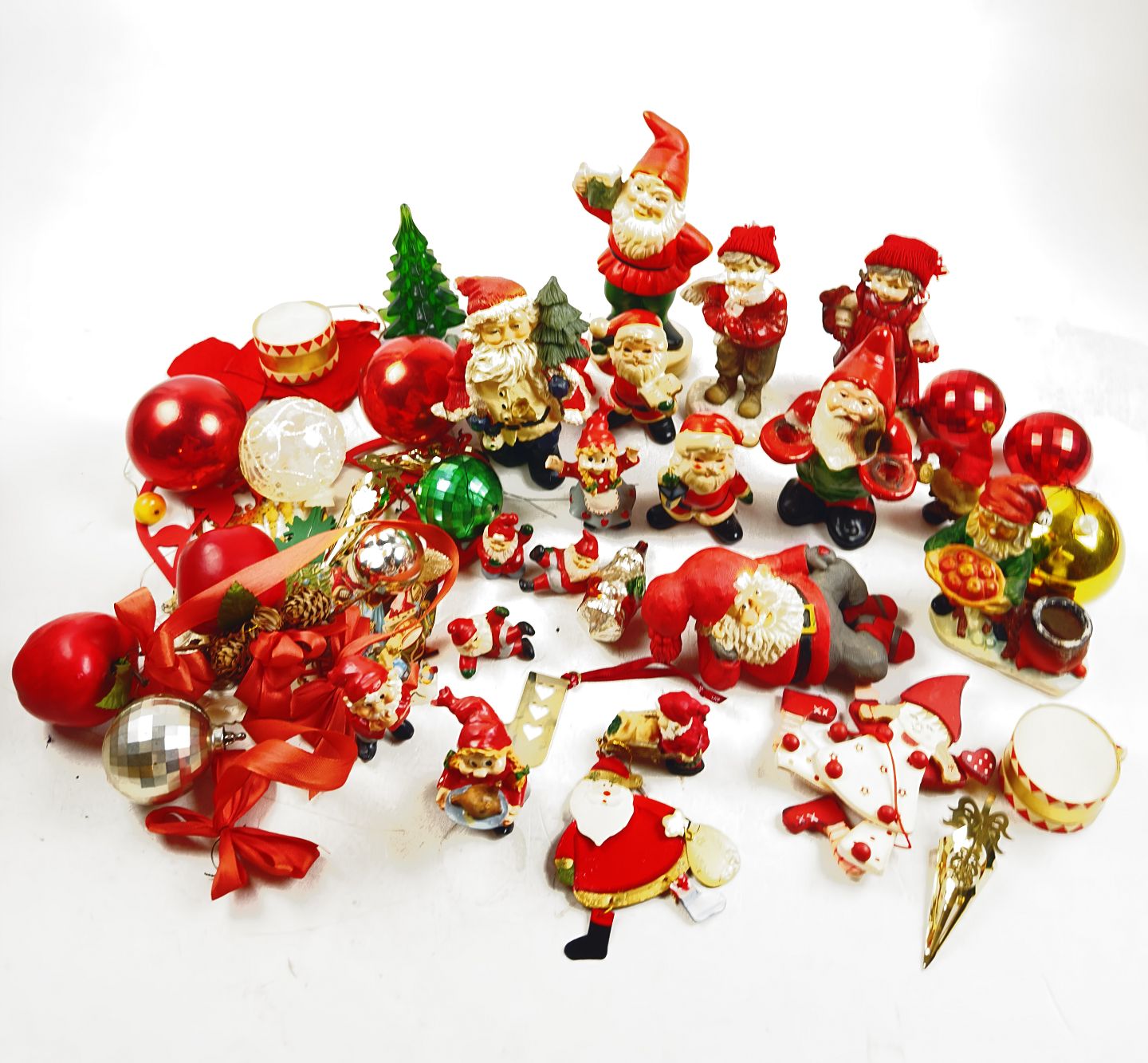 En større samling diverse julepynt bl.a. bestående af nisser og julekugler. Af nyere dato. En enkelt gammel julekugle i form af julemand.
