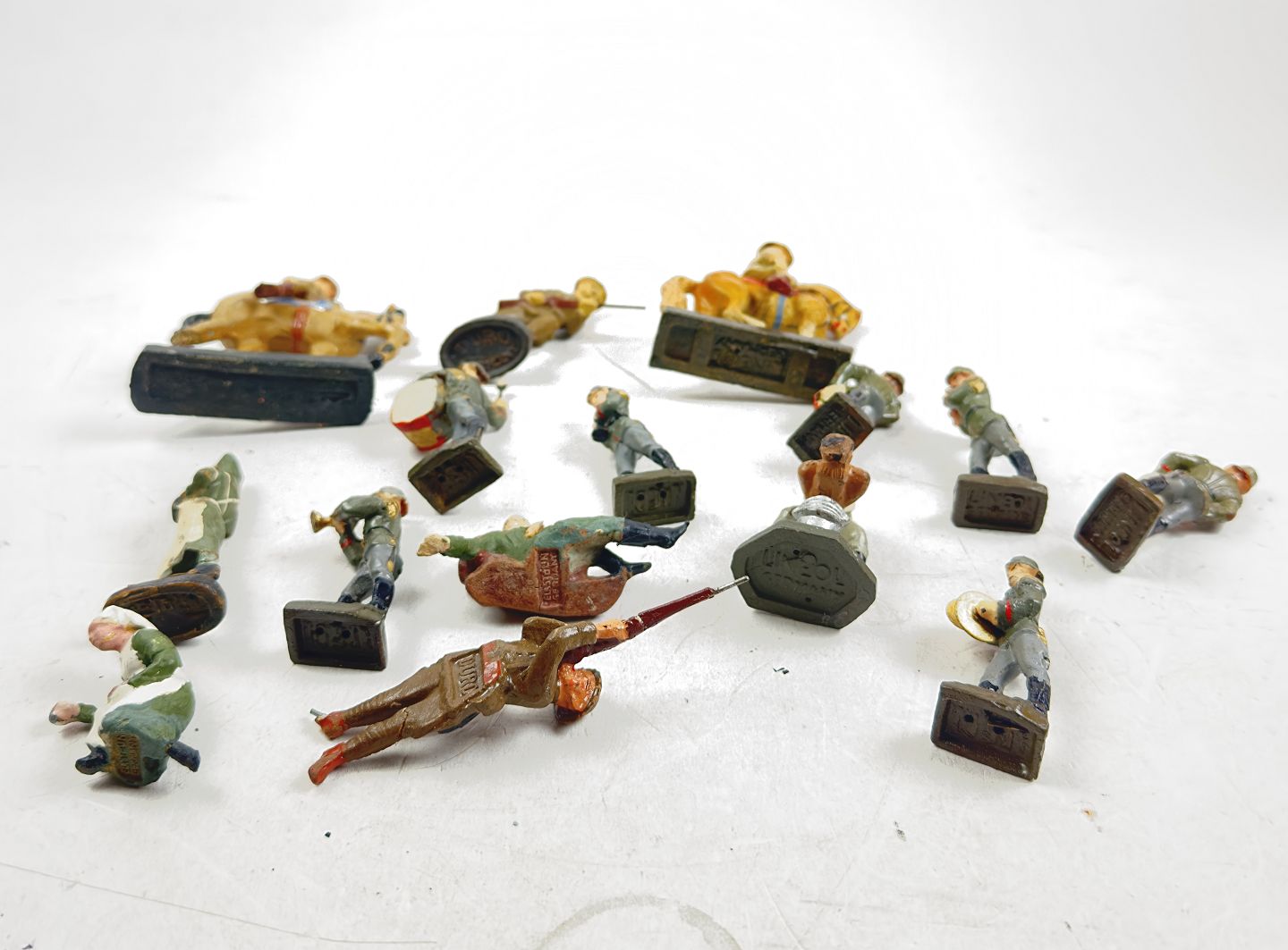 Lineol, Duro, Elastolin m.fl - En samling soldater, sygeplejerske m.m. Heraf flere orkester soldater. H. ca. 4,5-9,5 cm.