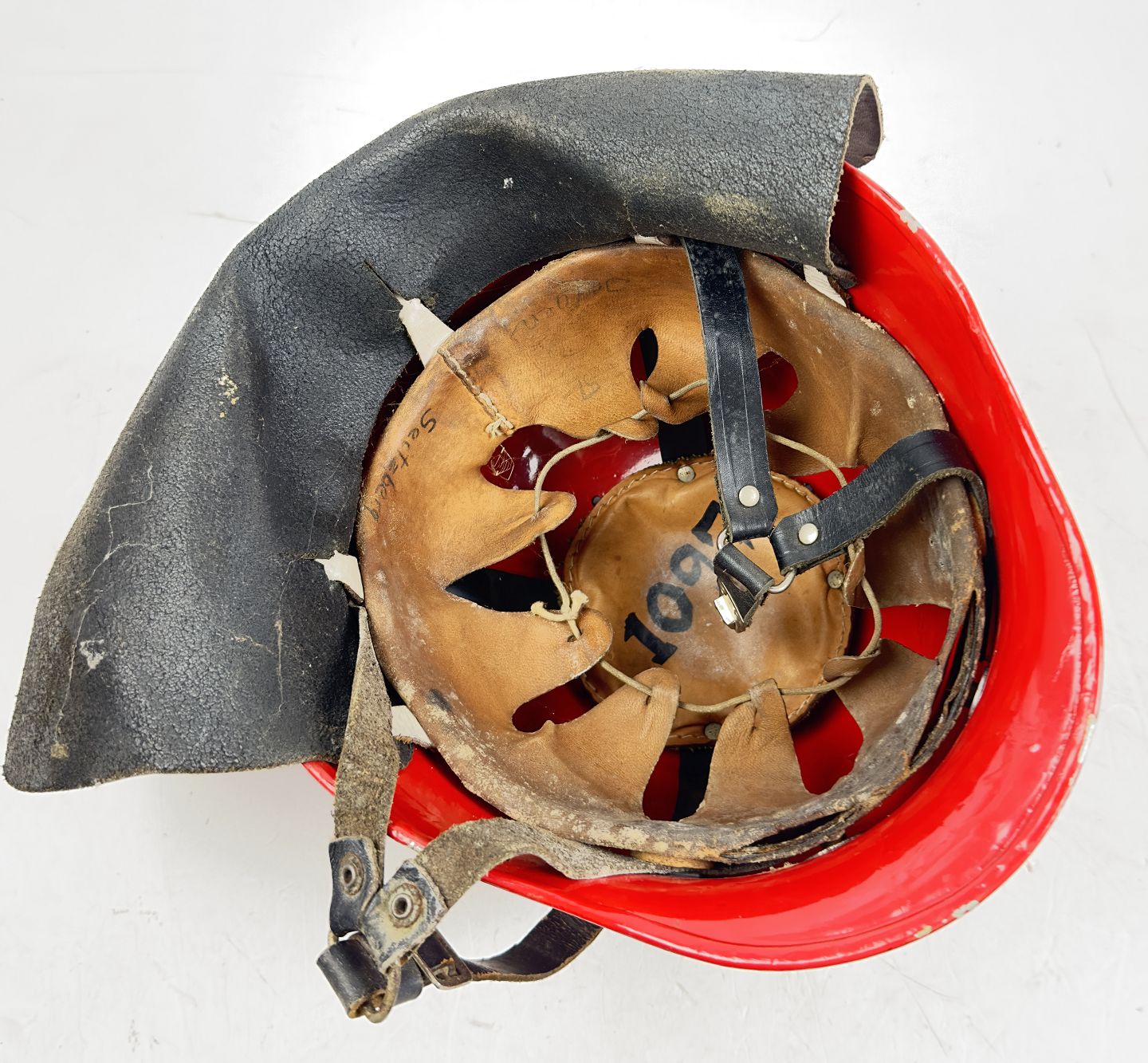 Brandhjelm af rødlakeret metal