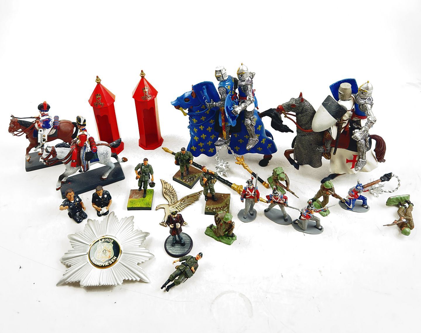 to model skilderhuse, flere ryttere til hest, flere figurer med rustninger.