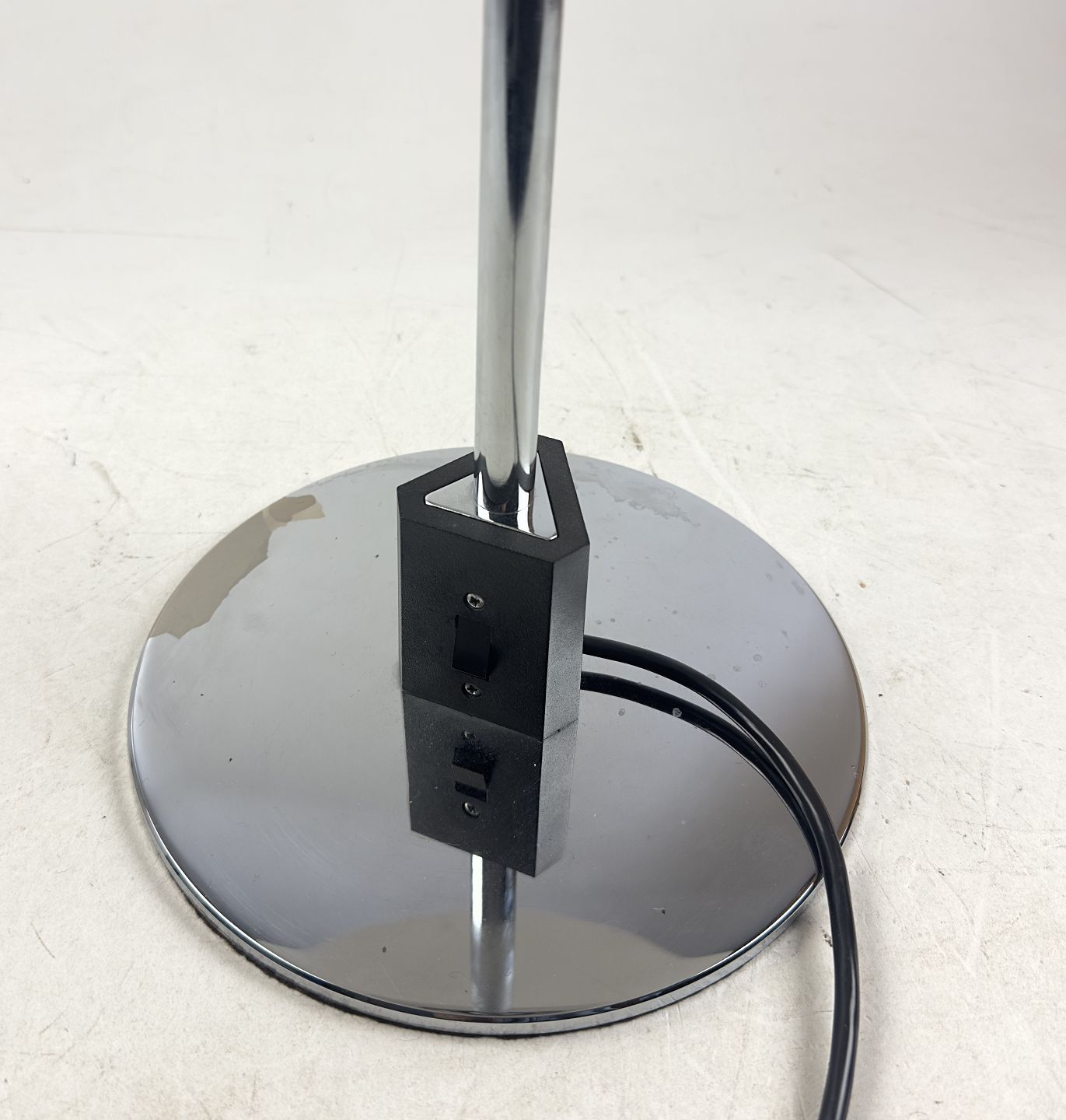PH 4/3 bordlampe med hvid, vådlakeret overskærm, stamme og fod af forkromet metal. Overskærm diameter 44 cm., H. 57 cm.