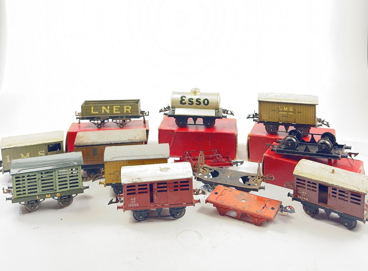 Hornby m.fl. - En samling diverse togvogne. Bl.a. bestående af milk traffic van, timber wagon samt pertrol tank wagon "esso". L. ca. 17-20 cm.
