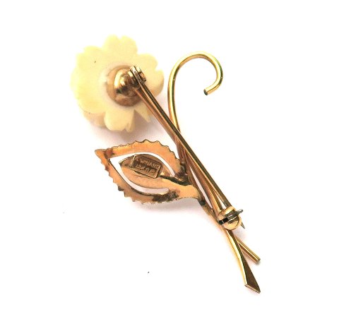 Vintage broche af 12 kt. guld, prydet med skåret rose af ben. L. 50 mm., samlet vægt ca. 3,5 gr.