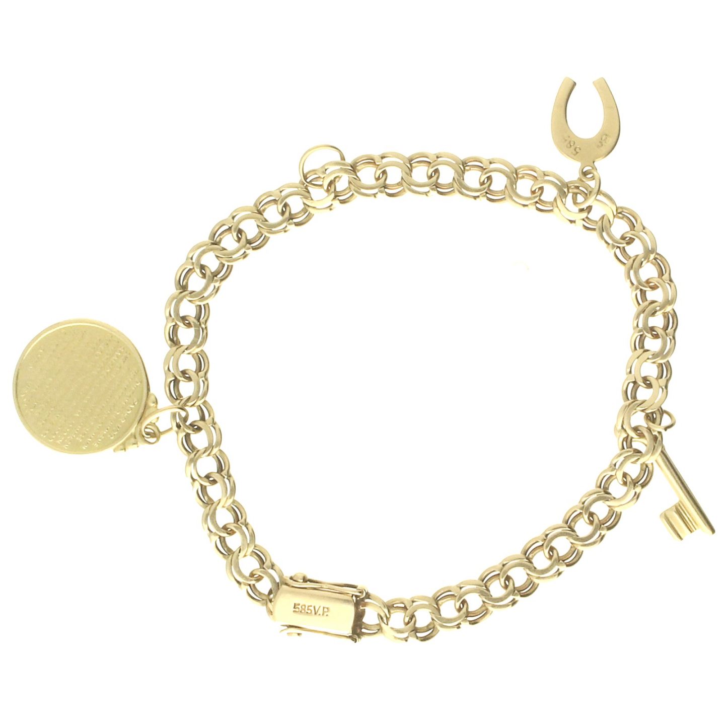 Bismarck armlænke prydet med tre charms udført af 14 kt. guld. L. 19 cm. Vægt: ca. 14,34 gr. Fremstår med et manglende charm.