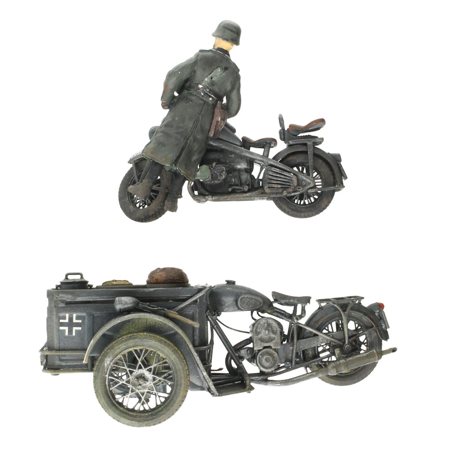 To miniature motorcykler af metal udført af bemalet metal. L. 9-13 cm. Af nyere dato. Motorcykelist knækket ved styret.