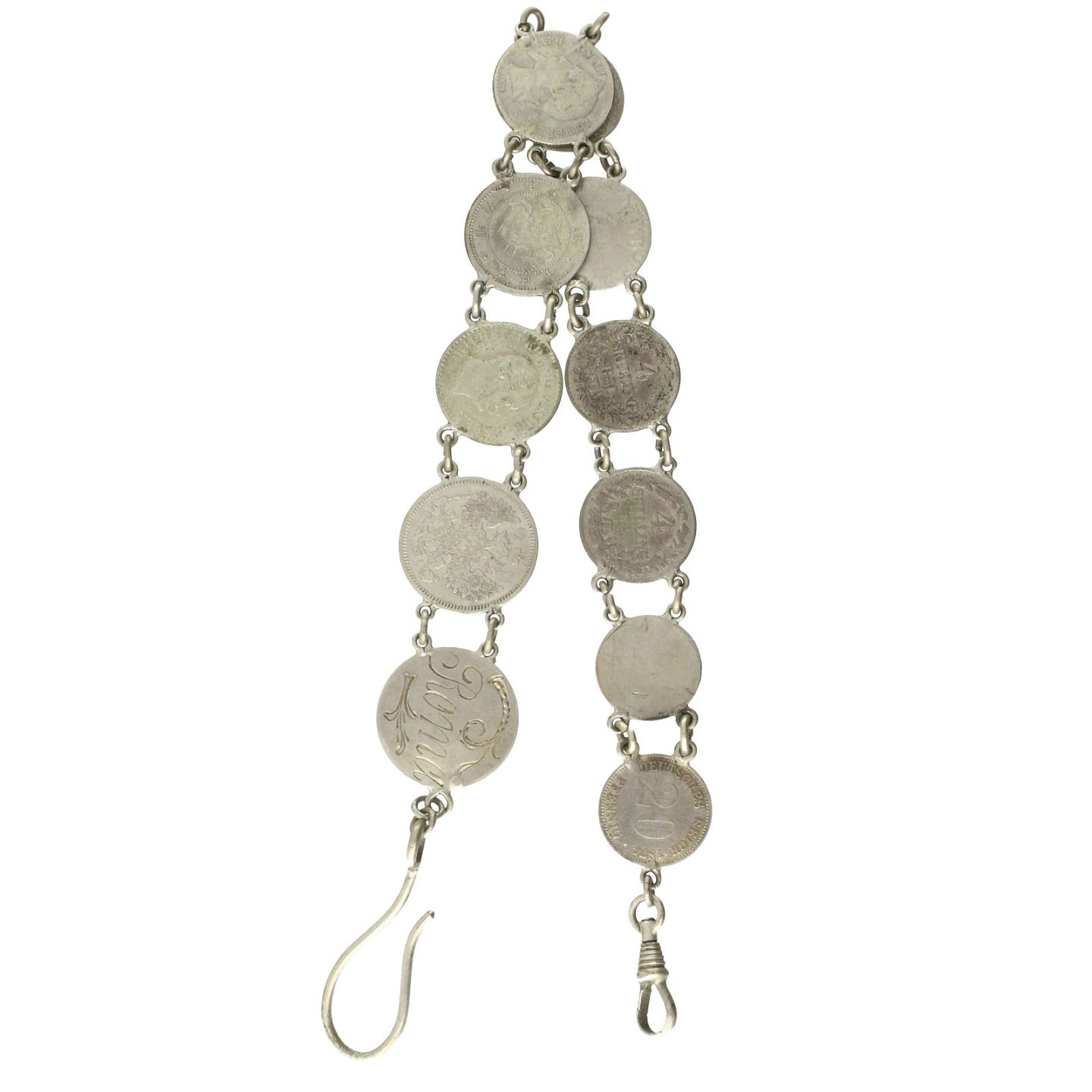 Urkæde monteret med diverse gamle mønter. L. 30 cm. Totalvægt: ca. 27 gr.