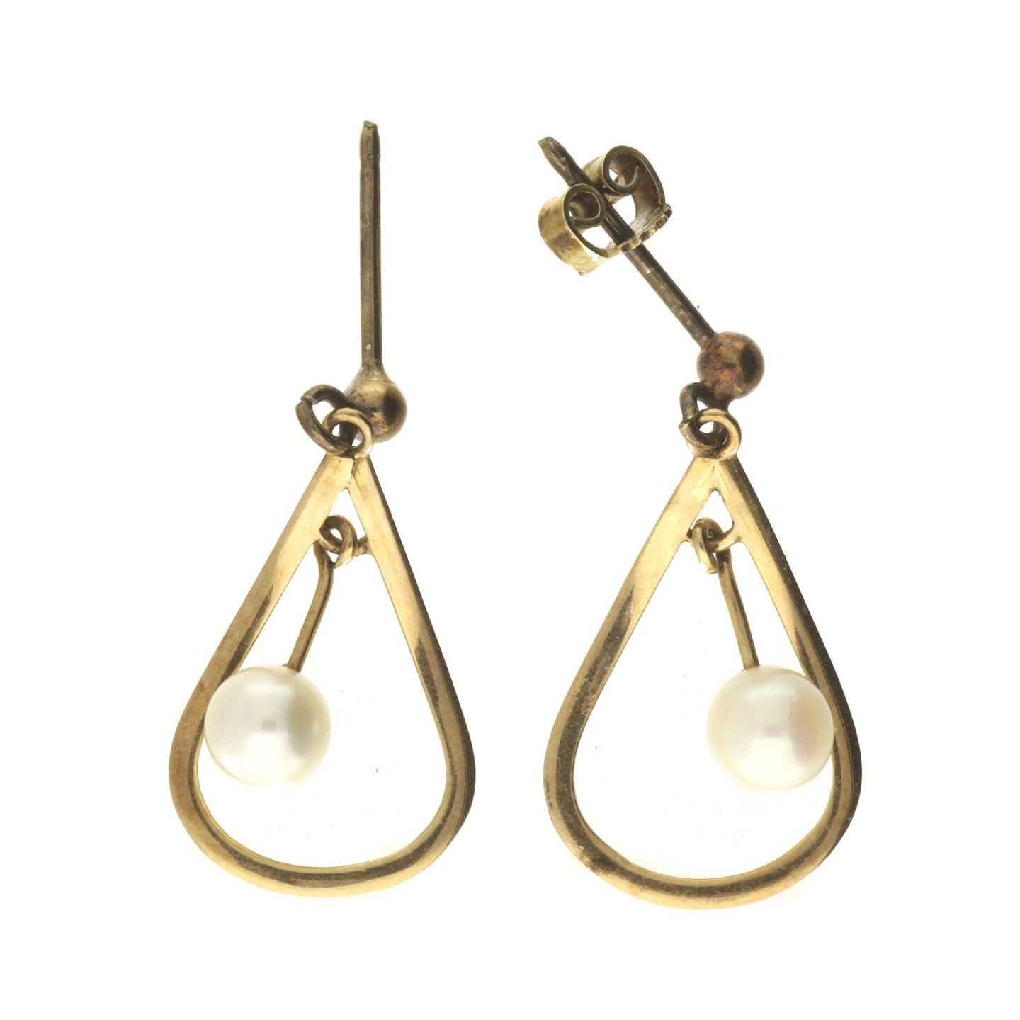 Par ørestikker udført af 8 kt. guld prydet med to perler. En lås udført af 14 kt. guld. L. 26 mm. Vægt: ca. 3,10 gr.