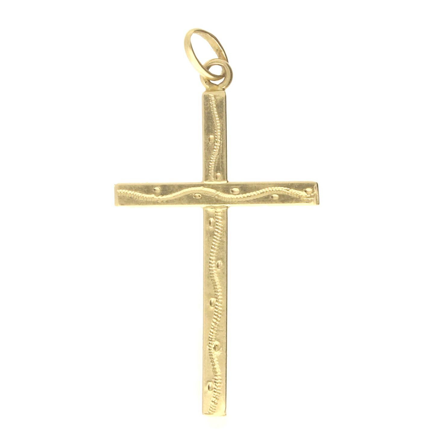 Kors udført af 18 kt. guld. L. inkl. øsken: ca. 43 mm. Vægt: ca. 1,85 gr.