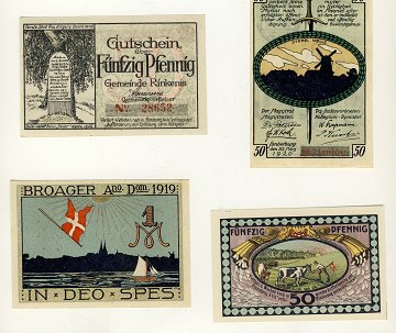 S.O.S, 5 krone ark med 4 sammenhængende mærker. Endvidere lot diverse nødpengesedler