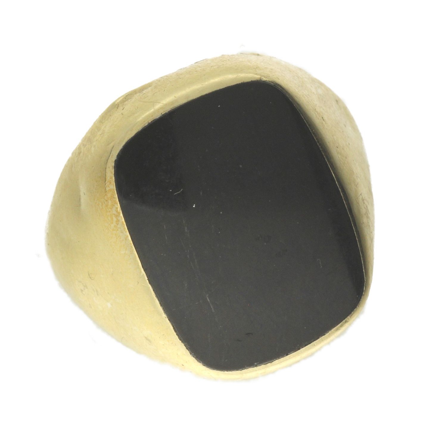 Herrering udført af 8 kt. guld fattet med sort onyx. Ringstr: 63. Vægt: ca. 6,73 gr. Fremstår med indgravering indvendigt i ringskinne.