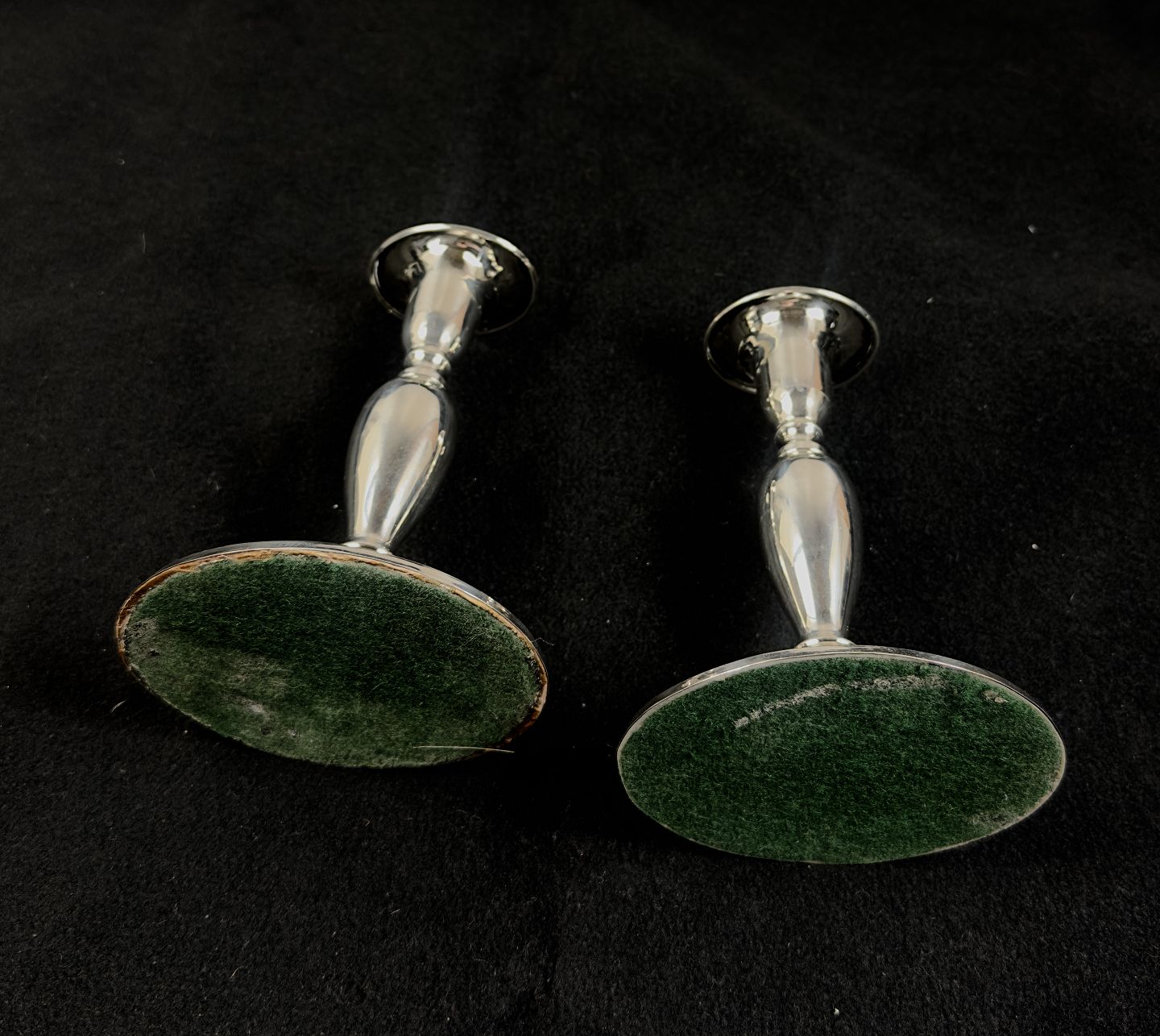 Par lysestager udført af sølv. Stemplet 830. H. ca. 14,5 cm. Samlet vægt: ca. 341 gr.