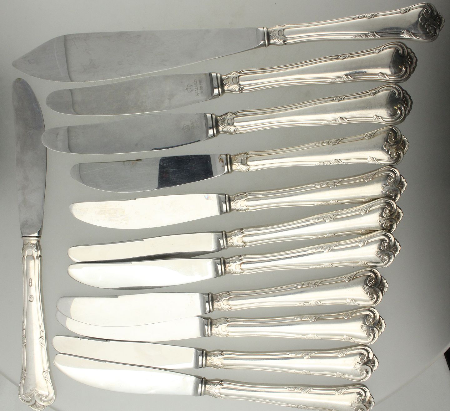 Cohr - 'Herregaard' 11 frokostknive samt 1 lagkagekniv udført af sølv med stålmonteringer. Stemplet Cohr, 830. L. på frokostknive: 20 cm. L. på lagkagekniv: 26 cm.