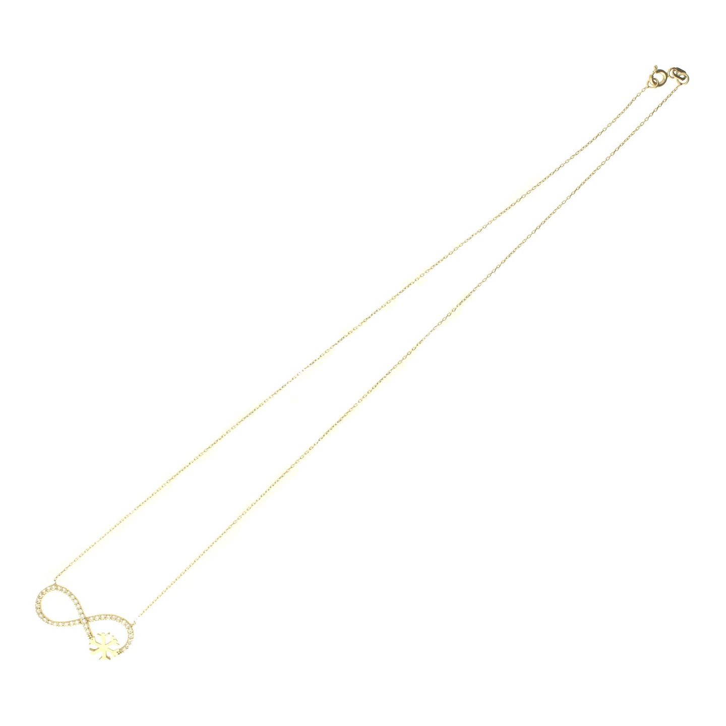 Halskæde udført af 14 kt. guld prydet med et integreret vedhæng i form af et uendelighedstegn. L. 43 cm. Vægt: ca. 2,45 gr.