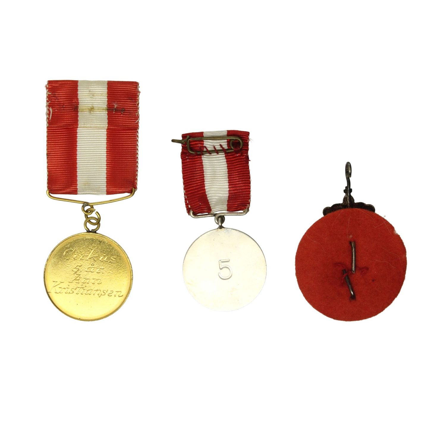 To medaljer samt emblem udført af metal, heriblandt en medalje af forgyldt metal (denne med indgraveringer). Ø. på medajler: ca. 24-25 mm.