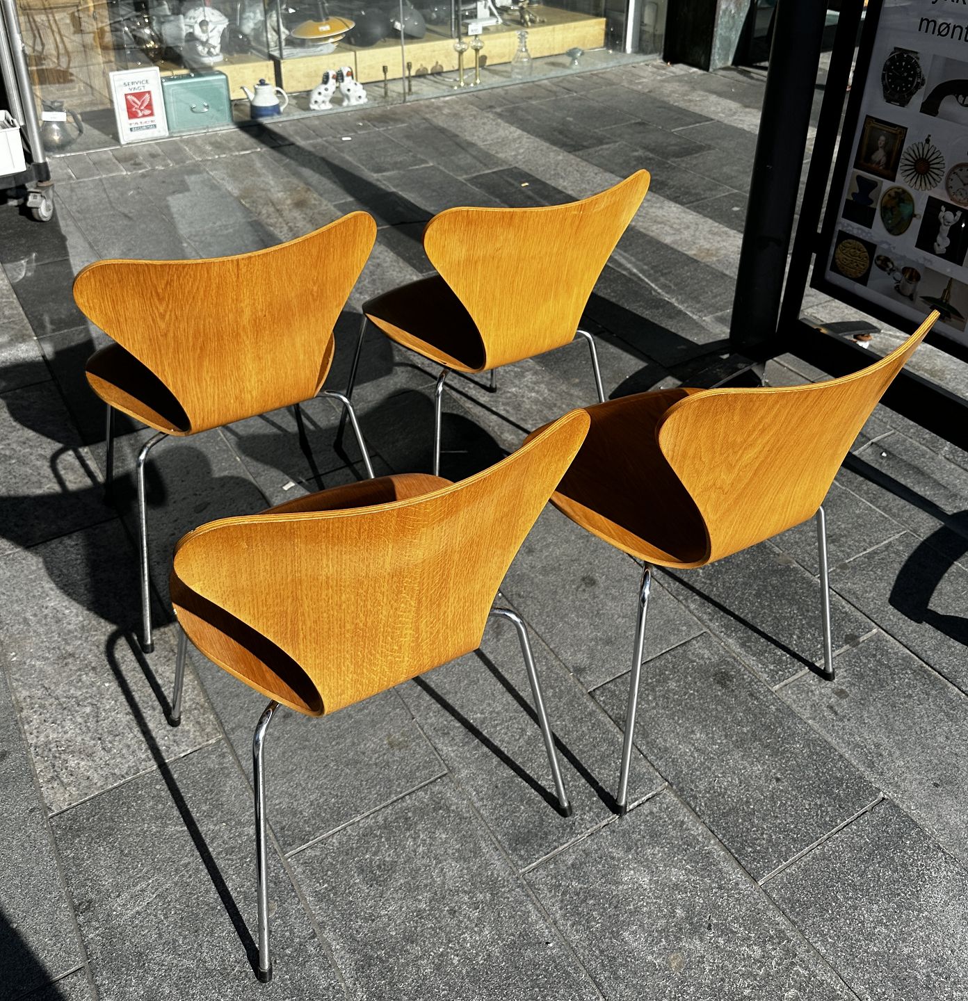 Arne Jacobsen - Fire syverstole med skaller af formspændt finéret asketræ, forkromet stål stel. Formgivet i 1955. Fremstillet af Fritz Hansen, model 3107.