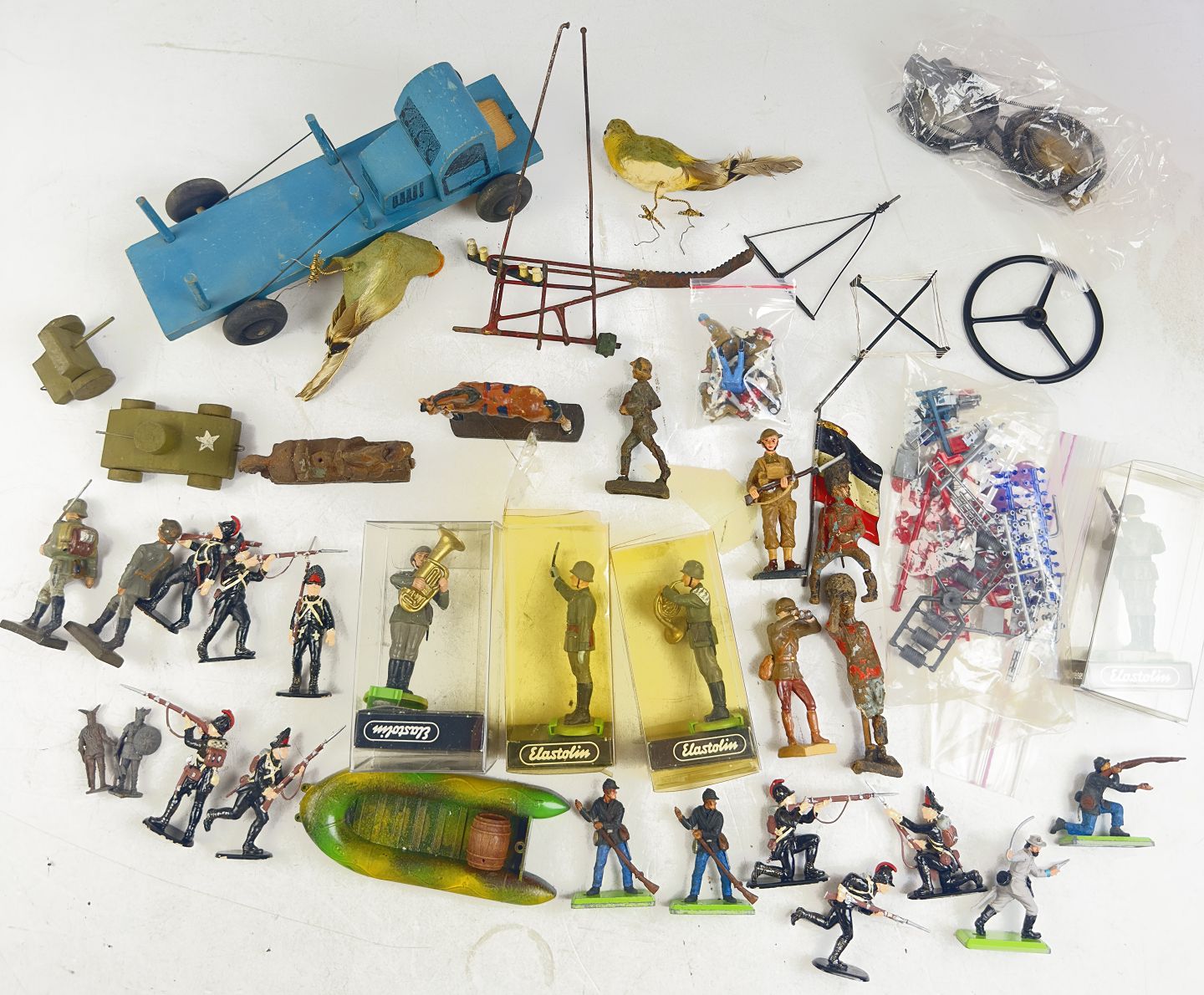 Lineol, Elastolin m.fl. - En samling diverse soldater, model bil m.m. Varierende brugsspor. Flere dele med defekter og afskalninger.