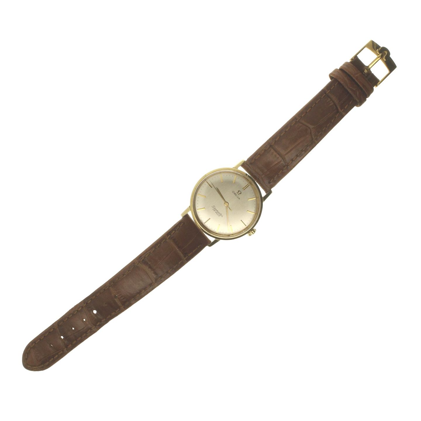 Uret har en 34,5mm kasse af guld 14kt. kassen er monteret på en brun læderrem, afsluttet med Omega c-spænde af forgyldt stål. Uret har en flot sølvfarvet skive med stregindeks. Uret er udstyret med et mekanisk værk med manuelt optræk.