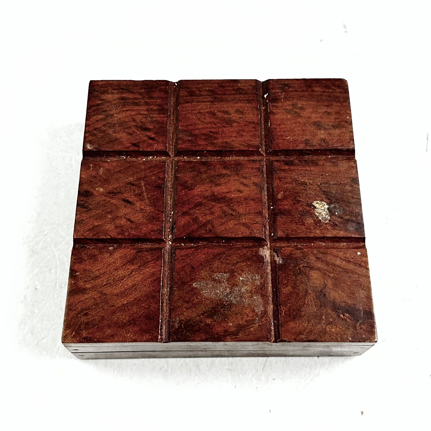 Kryds og bolle spil udført i træ. Ni brikker medfølger. Mål: 12,5 x 12,5 cm. Fremstår brugt med pletter samt slitage ved messing hængsler.