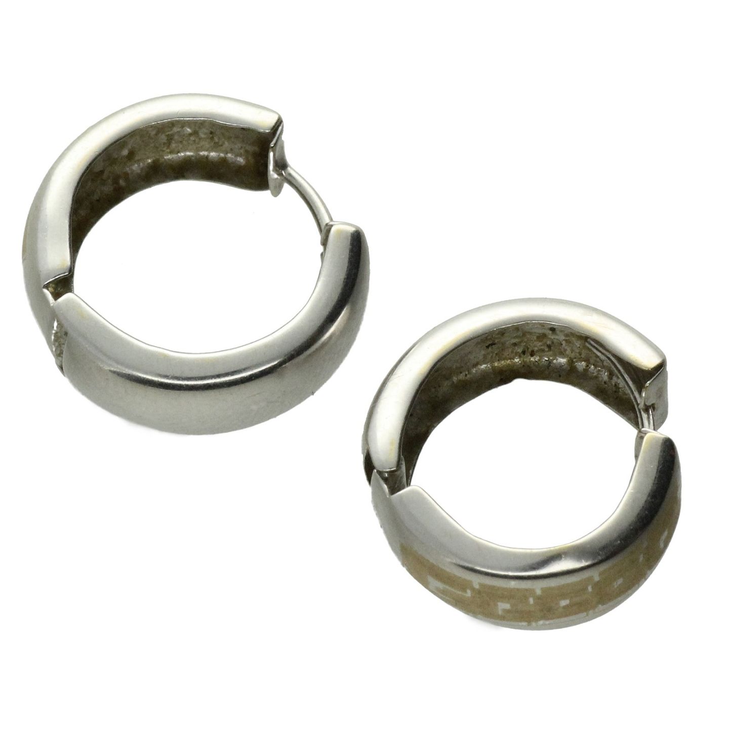 Par creoler af 14 kt. hvidguld. Ø. 16 mm B. 6 mm. Vægt: ca. 2,88 gr. En ørestik fremstår med skævhed.