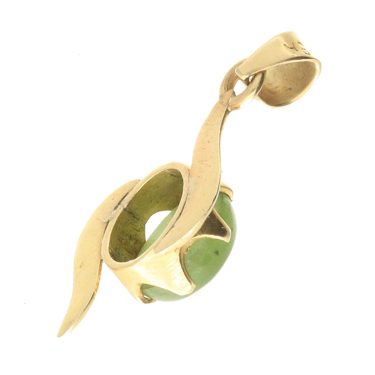 Vedhæng udført af 18 kt. guld fattet med grøn sten. L. inkl. øsken: ca. 23 mm. Vægt: ca. 1,23 gr.