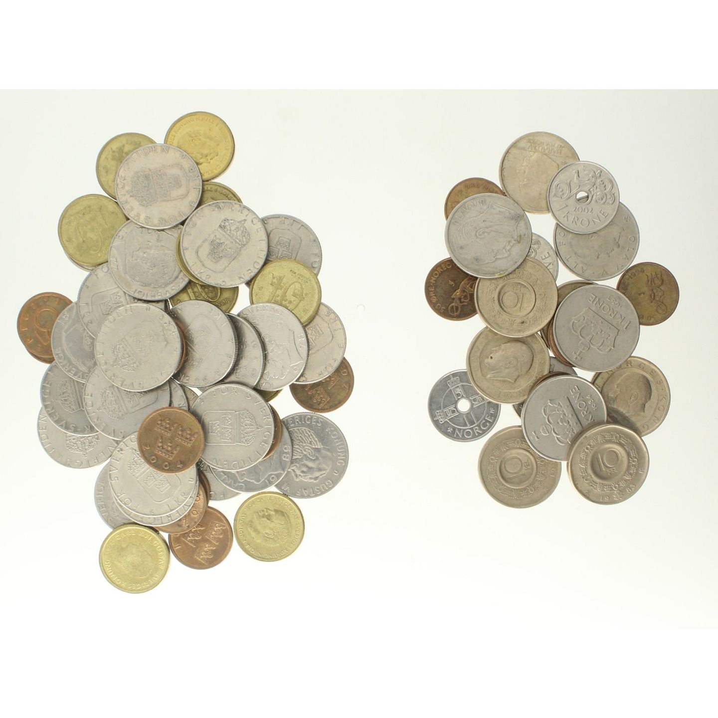 Møntlot, gyldig valuta: Norge 80,50 kr; Sverige 129,50 kr, Euro €2,77 og Danmark 50,50 kr i 50-ører. Samt diverse ugyldig valuta.