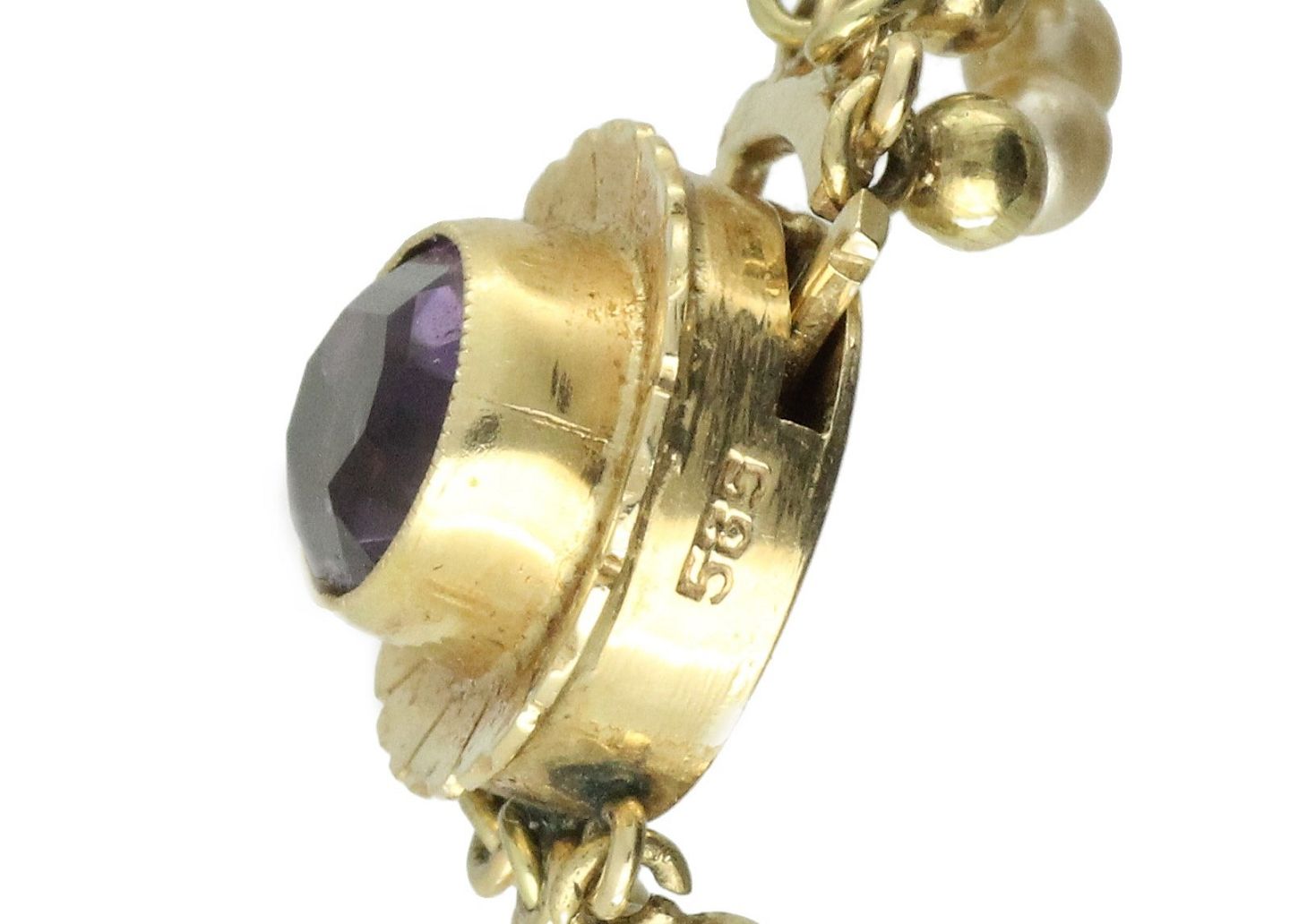 Tre-radet perlehalskæde med integreret lås udført af 14 kt. guld fattet med lilla sten. L. ca. 41 cm. Samlet vægt: ca. 33 gr.