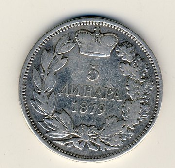 Serbien, 5 dinara 1879, Milan Obrenovich, 1868 - 1889
