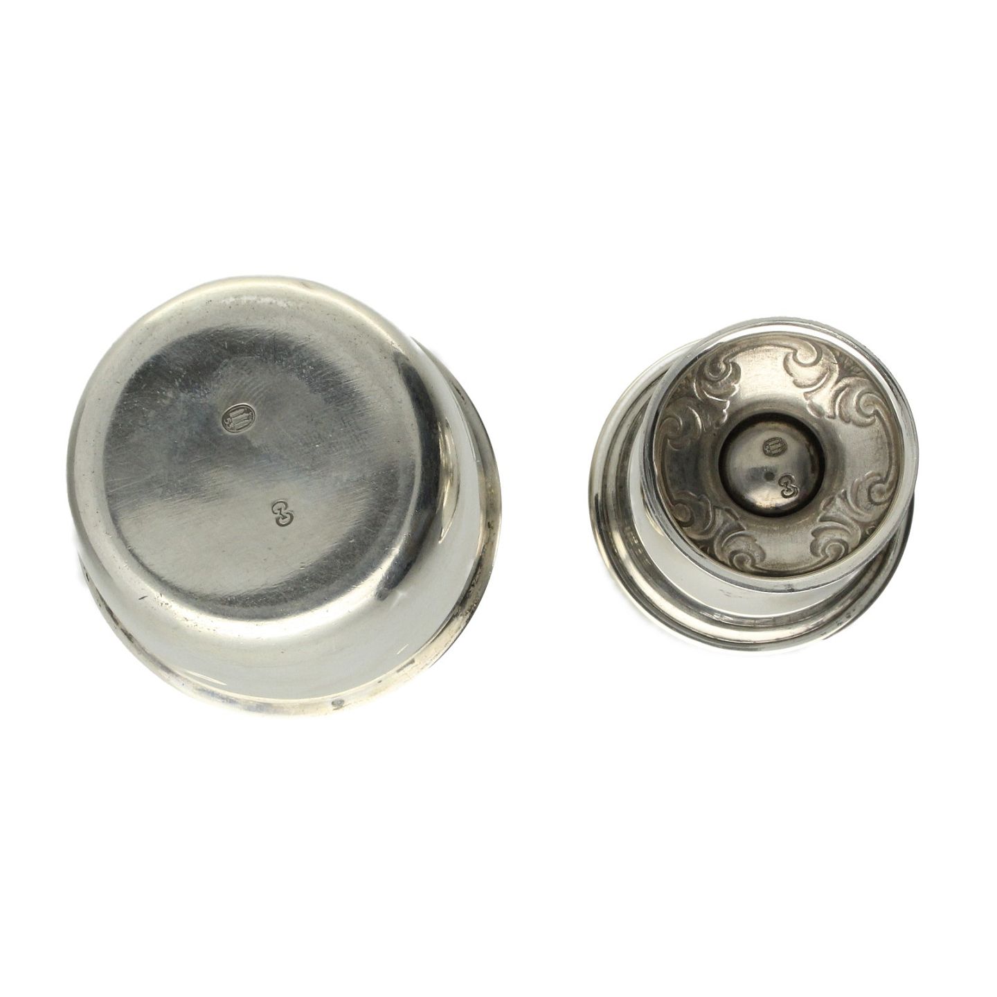 Bæger samt æggebæger af tretårnet sølv. H. ca. 5-6 cm. Samlet vægt: ca. 75 gr. Fremstår med indgraveringer, bæger med lille bule.
