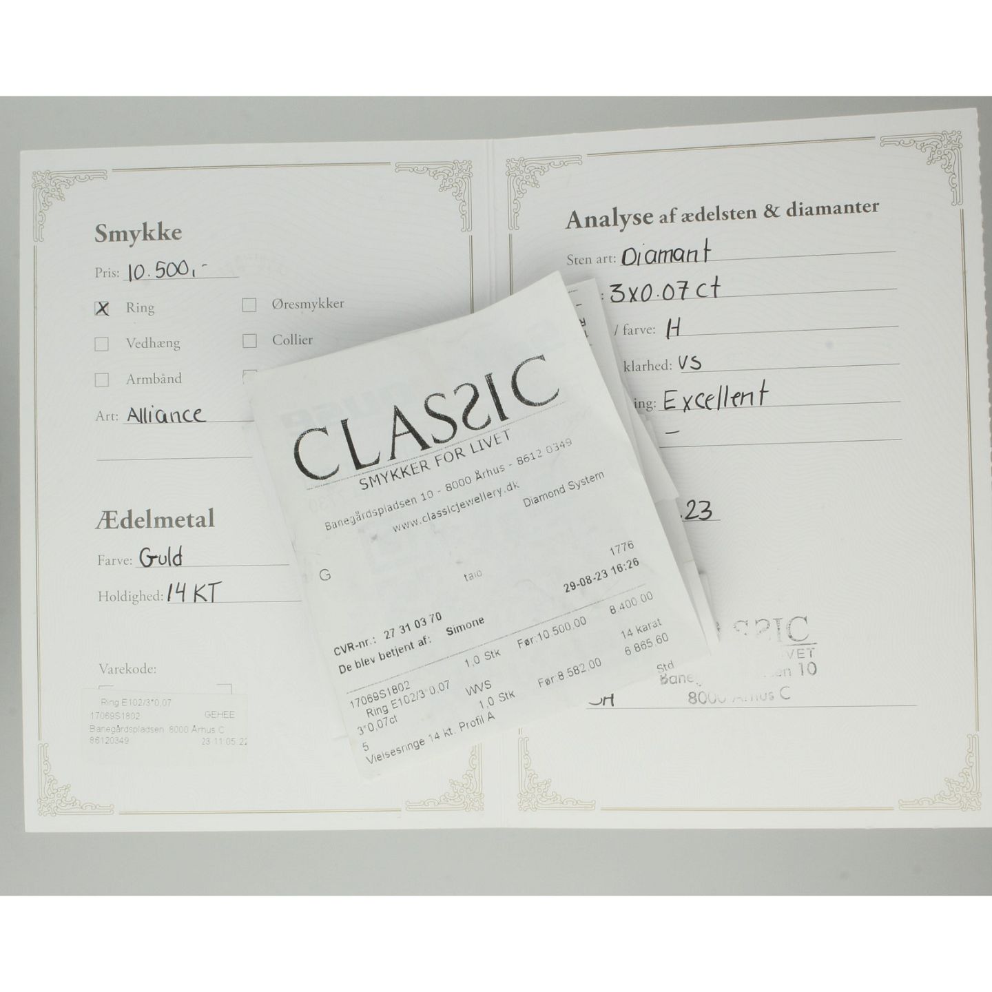 Alliancering udført af 14 kt. guld fattet med tre brillanter på i alt ca. 0.21 ct. Ringstr: 48. Vægt: ca. 3,08 gr. Certifikat samt købskvittering medfølger.
